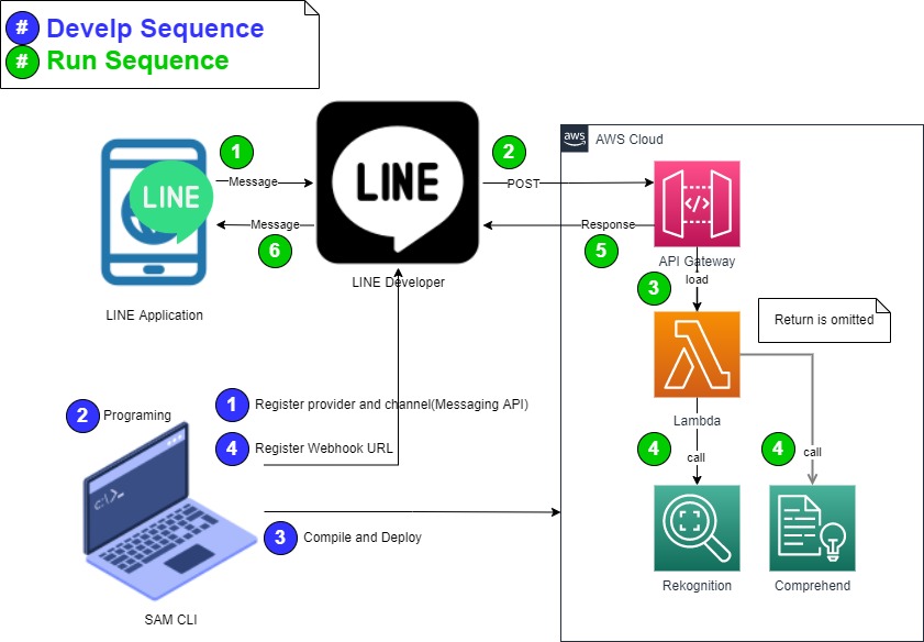 サーバレスアプリをAWSのLambdaで作成し、LambdaからAWSのAIサービスを呼び出す仕組みを作ってみました。サーバレスアプリの呼び出しは単純なRESTリクエストではなく、LINEアプリからのメッセージ送信という方法を選択しました。